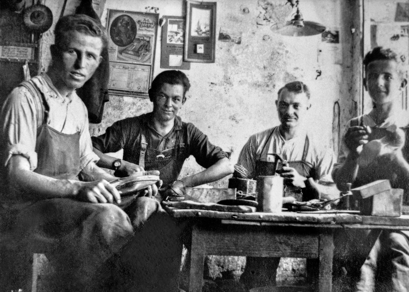 Ernst Risch eröffnet seine Schuhmacherei und fertigt von Hand gefertigte Schuhe. Hier (links im Bild) im Jahre 1924 mit seinen Schuhmachergesellen in der Schuhmacherwerkstatt.